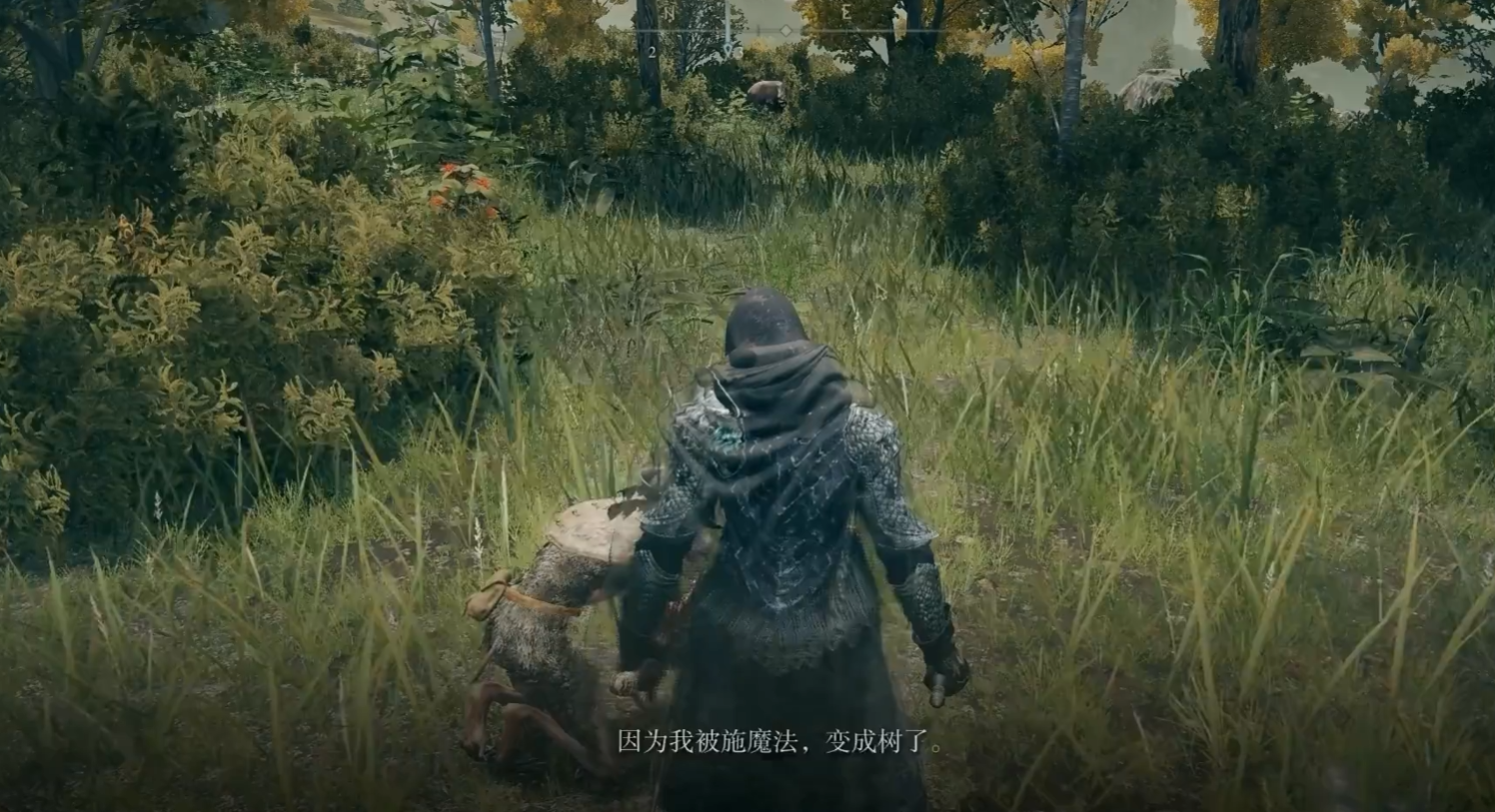 另一种情况是在废墟前听到我知道你看得见我,帮帮我的声音。声源是一棵特别高的树或附近的草丛,仔细查看会发现颜色枯黄的小树枝,这是被变成树枝的小老头。若树上没有,可在草丛中翻滚寻找。这一机制设计体现了游戏对探索细节的鼓励,玩家需耐心观察环境中的不协调之处。