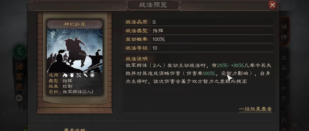 诸葛亮自带的神机妙算战法特别霸道,能打断敌人的主动技能还附带伤害,主将位时还能根据智力差加伤。兵种推荐弓兵或枪兵,弓兵搭配无当飞军能提升统率和速度,枪兵则适合打控制流。前期可以搭配关平、臧霸组枪兵队,利用双控体系过渡;中期转型西蜀之智组合(徐庶、法正),后期再考虑吕蒙、程昱等高配队友。平民玩家用兵无常势、夺魂挟魄这类A级战法也能玩得很舒服。