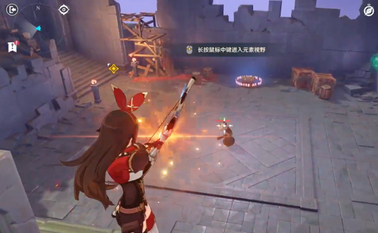 接下来会遇到一些丘丘人和盾牌怪,优先解决拿盾的,因为盾牌会挡住大部分攻击。场地里的红色炸药桶别忽略,射爆它们能造成范围伤害,还能炸飞小怪。如果遇到飞在天上的风史莱姆,赶紧切换弓箭手射下来,打掉三个后会出现风场,这时候双击跳跃键就能乘风飞上去。