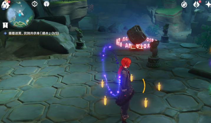 千来神祠区域的栖木解密相对简单,主要依靠元素视野追踪羽毛位置。开启元素视野后,地面会出现明显的元素痕迹引导路线,跟随痕迹可找到三片散落的羽毛。供奉羽毛后迷雾会逐渐消散,才能清晰看到栖木周围的火炬位置。逢岳之野的栖木位于地图左上角靠近海岸的位置,该区域需要先击败守护怪物才能接触栖木。此处的火炬解密涉及继电石机关,需收集三个继电石并正确连接电路才能开启封印。