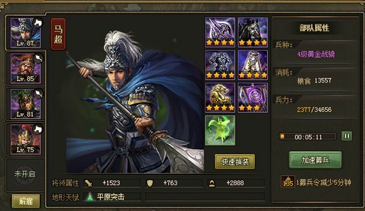 马超要充分利用地形加成,穿着青龙或鲮鲤套装压制被典韦晕住的敌人。这里最关键的是要抵挡住庞统的群攻战法,如果没挡住就得重来。最后上场的徐晃或魏延要注意战法可能被抵挡的问题,可能需要多试几次。兵器方面左边建议升到61级,右边12级左右就够用了。