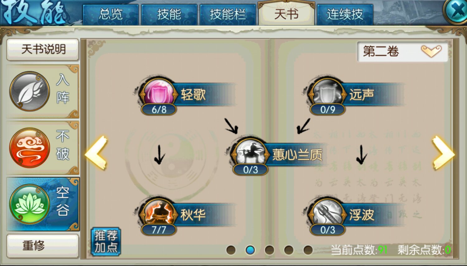 技能加点的优先级需围绕核心流派展开。爆发流需优先点满云梦深处、百花缭乱及暴击增益被动;控场流侧重木灵缚的魅惑时长与回风拂柳的无敌帧;消耗流则需确保治疗技能等级与天书空谷的免负面效果联动。被动技能如根茎(魅惑精通)、矫健(移速加成)等通用性强,无论何种流派均应适度投入。天书第一卷的芬菲映月提升基础属性,第二卷轻歌连绵强化控制与连招流畅度,第五卷梅花三弄则对群体伤害有显著增益,需根据流派需求分配剩余点数。