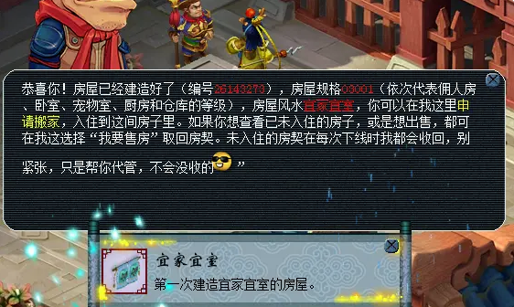 房屋建好后别忘了找建房吏申请搬家,之后就能通过长安杂货店门口的轿夫传送回家。入住后可以随时找建房吏调整房间分配或升级房屋。如果想扩大庭院面积,可以提交庭院扩建图并支付游戏币,初级庭院扩建到大型庭院大约需要十天时间。记得每天查看工匠头子的进度,适当投入资源能加快扩建速度。