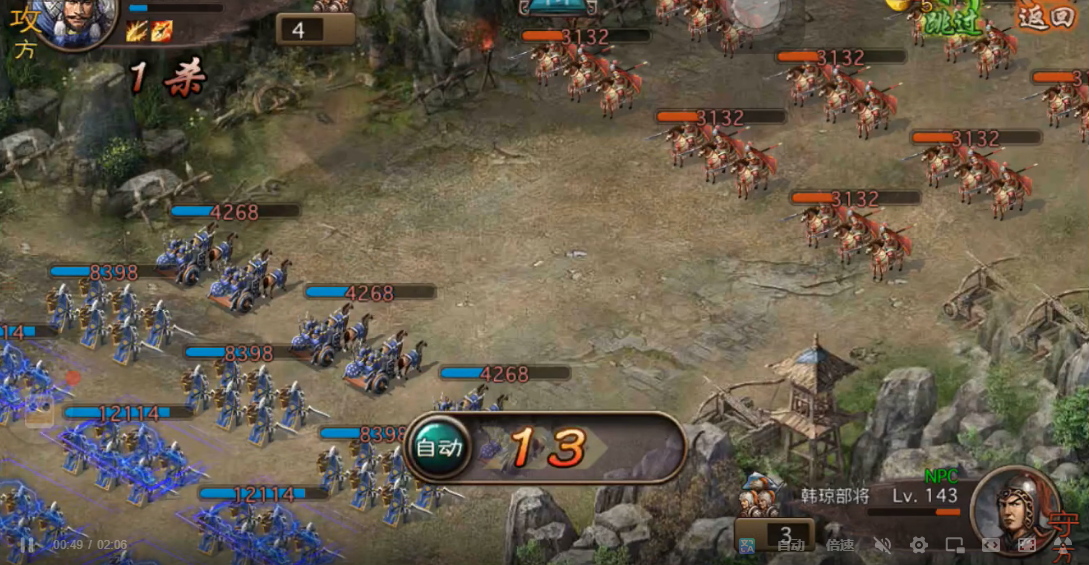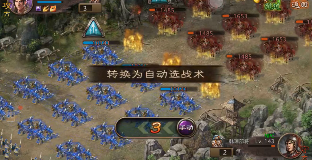 张飞上场后直接使用克制技能,解决掉小兵残血和韩琼第一排后,应该还能剩下4100-5200血量。韩琼战法伤害在3100-3400左右,吃完战法后张飞还剩三排6300+血量和一排1000+血量。这时候就要看运气了,1000+血量那排如果能触发斩杀秒掉韩琼第二排,后面就轻松多了。剩下的两排张飞用防御克制砍完韩琼第三排,一般能剩1300-1700血,随便砍一下第四排后放战法收尾。