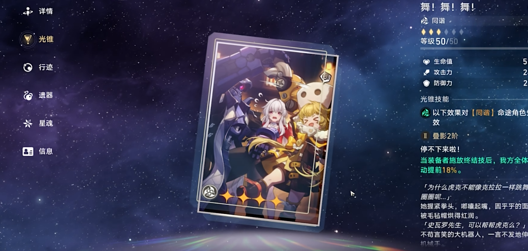 我想提一下光锥培养的配套思路。获得了光锥只是第一步,将它升级和晋阶才能发挥真正的作用。光锥的晋阶需要消耗各种材料,这些材料通常通过刷取对应的副本、完成日常任务或参与活动来获得。对于新手来说,不要急着把所有资源都投在一个光锥上,可以先集中资源培养主C角色的光锥,停云作为辅助,她的光锥可以稍后一步,选择一款增加能量回复效率或团队增益效果的四星光锥先带着,比如轮契或记忆中的模样,就能在前期队伍里起到很不错的作用。