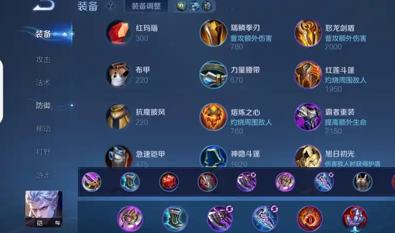 其实铠还有一种更肉的玩法,俗称重装打野或者双烧流。这种玩法更偏向于当一个能扛能打的战士前排。打野刀选择巨人之握,也就是肉打野刀。鞋子可以选择抵抗鞋或者冷却鞋。核心装备是红莲斗篷和黄盾,这两件装备能让你对周围的敌人造成持续的灼烧伤害,清线刷野都很快。之后的装备就全堆肉了,比如不祥征兆、魔女斗篷、永夜守护这些,看对面物理伤害高还是法术伤害高来针对性地出。这种出装的铠,虽然瞬间爆发没有那么夸张,但持续作战能力非常强,开着大招在人群里能扛很久,为队友创造输出空间,特别适合队伍里缺前排的时候玩。