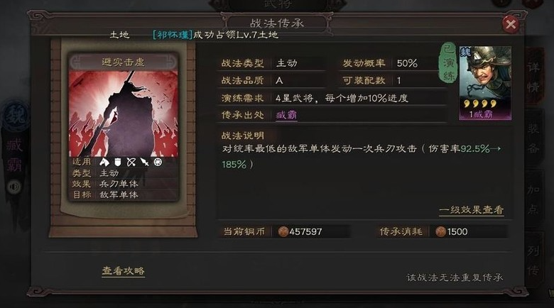 关羽自带战法威震华夏那是相当有名,放出来能打对面全体还能随机给人上缴械或者计穷这类控制状态,要是让他当主将,发动后自己还能加一波兵刃伤害,属于那种又能控场又能爆发的核心将领。而避实击虚呢,是一个A级战法,传承自武将臧霸,获取起来不算太难。它的效果简单直接,就是瞄准对面队伍里统率值最低的那个倒霉蛋,发动一次兵刃攻击,满级后伤害率能达到185%,而且有高达50%的触发概率,还是个瞬发技能,不用准备回合,这在开荒或者打架的时候用起来感觉特别顺手,属于点杀能力很强的一个战法。