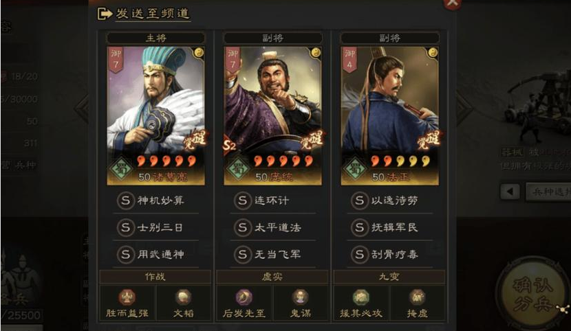 庞统本身是纯粹的谋略输出核心,自己没啥保命和控制能力,所以非常依赖队友。一个经典的、强度很高的组合就是和姜维、诸葛亮一起组麒麟弓(也叫蜀智队)。在这个队伍里,姜维可以稳定地降低对手属性并输出伤害,诸葛亮则能提供强大的反制和控制,专门克制那些靠主动战法吃饭的对手,庞统就可以安心地在后边当主炮台。这个组合有国家阵营的属性加成,配合起来非常默契。另一个传统的搭配是和诸葛亮、法正组蜀智队,利用西蜀之智的缘分获得更多增益。如果这些武将凑不齐,庞统也可以和其他高爆发的谋略武将搭配,比如和周瑜、陆逊组队,利用他的铁索连环效果来放大火烧的伤害。由于庞统的速度通常比较慢,战法又需要准备一回合,所以最好队伍里能有一些提供先攻效果的手段(比如兵种白马义从),或者给他带上后发先至的兵书,确保他的连环状态能在队友出手伤害之前挂到敌人身上,这样才能打出联动的爆炸效果。