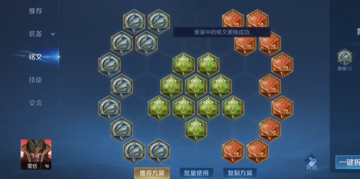 铭文方面推荐使用标准的百穿铭文搭配,包括红色异变、蓝色隐匿和绿色鹰眼,这套铭文能有效提升蒙恬前期的清线和游走效率。隐匿提供的移速加成有助于他更快支援队友,异变和鹰眼则提供物理穿透和攻击力,这样在线上对拼时能占据优势。蒙恬对攻速需求不高,因此铭文重点强化物理输出和机动性,让他能更灵活地调整站位和追击敌人。