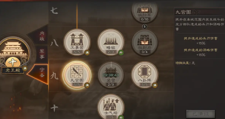 除了单纯升级城墙本体,你还需要关注与城墙防御体系配套的其他设施和科技。在城建系统的守备类别中,你可以建造和升级箭塔。箭塔能够远程攻击来犯的敌军,对攻城部队进行有效压制,是城墙防御的重要补充。游戏内的科技研究也对城墙防御有巨大影响。比如九宫格和八卦阵这两项技术,能够为你在主城及附近地块作战的部队提供可观的攻防属性加成,这相当于间接强化了以城墙为核心的防御圈的作战能力。将这些防御建筑和科技与高等级城墙才能构筑起立体的防线。