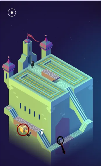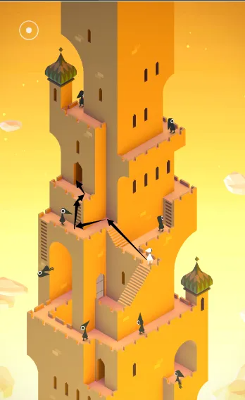 关卡开始时,玩家应利用岔口和小亭子避开乌鸦人,走到玫红色按钮处按下机关。在最初墙壁上会出现可旋转楼梯的把手,旋转把手将角色送至上层的玫红色按钮处,此时尖塔将出现爬梯。通过旋转按钮,让角色避开乌鸦人走到玫红色按钮,整个建筑将变幻旋转,从而打开新的路径。玩家需要小心操作,确保乌鸦人不会阻碍前进,并在适当时机转动平台清除障碍。