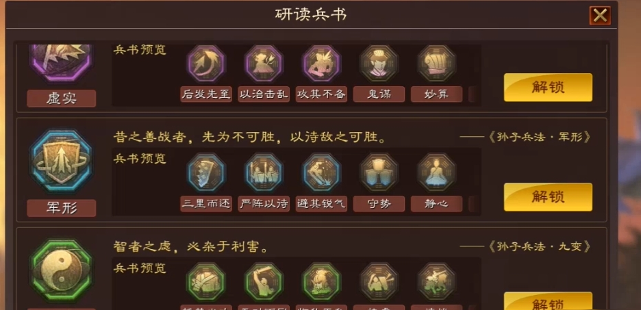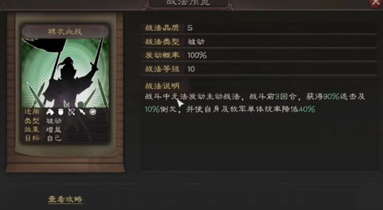 胜而益强和一鼓作气是两个常见的一级兵书选项,分别提供不同的增益方向。胜而益强能在普攻后概率恢复兵力,增强生存能力,而一鼓作气则提升突击战法的伤害输出,适合搭配连击类战法使用。第二和第三级兵书常固定为胜战和执锐,胜战在第二回合提供破阵效果以无视敌方防御,执锐则直接增加武力伤害,共同构建高爆发输出体系。