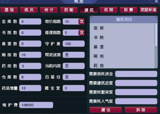 要建一个自己的三级帮派,最基础的条件就是得有足够的帮派资金、繁荣度和人气。帮派一开始是一级,没有任何建筑。帮派每次升级,比如从一级升到二级,再到三级,都需要你先把帮派里的两类建筑数量盖到当前帮派规模上限要求的数量。一级帮升二级帮需要两种建筑各建到4个;二级帮升三级帮则需要两种建筑都达到8个。这盖房子可不是白盖的,每建一个建筑都需要消耗帮派的资金、繁荣度,还需要200点人气。人气值特别关键,它只能靠帮派成员在线来增加,每个小时维护时有多少人在线就加多少点。如果人气消耗到零,帮派可就直接解散了,所以建帮初期一定要多招一些在线时间长的兄弟姐妹们。升级的那一刻,还需要额外消耗一笔资金,比如升二级帮大概需要1000万资金、1000点繁荣度和1000点人气。你得确保仓库里钱够、人气够,才能点下那个升级按钮。