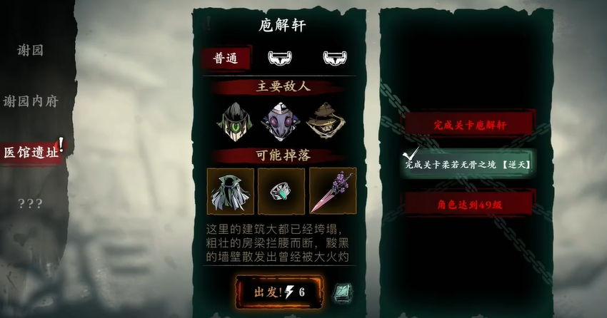 在推进这个流程的时候,有些细节需要你特别注意,以免卡住进度。医馆遗址本身是一个包含多个连续关卡的大副本,庖解轩只是它的第一关,后续还有像拼缝阁这样的关卡。部分后续关卡的解锁,甚至需要你先去通关前面关卡的更高难度,比如逆天难度。如果你在任务列表中没看到医馆遗址或者庖解轩,先这通常是因为你的主线任务进度还没推到那里,最有效的办法就是继续埋头推进主线剧情。游戏里有些支线任务虽然看起来可选,但最好也顺手清理一下,比如灭法司的残酷美学这个支线,就和医馆遗址的剧情关联密切,完成它们有时能帮助你更顺畅地解锁后续内容,避免因为遗漏了什么而耽误时间。