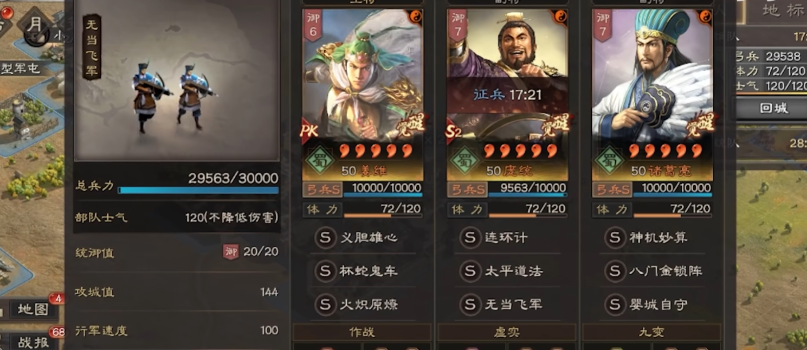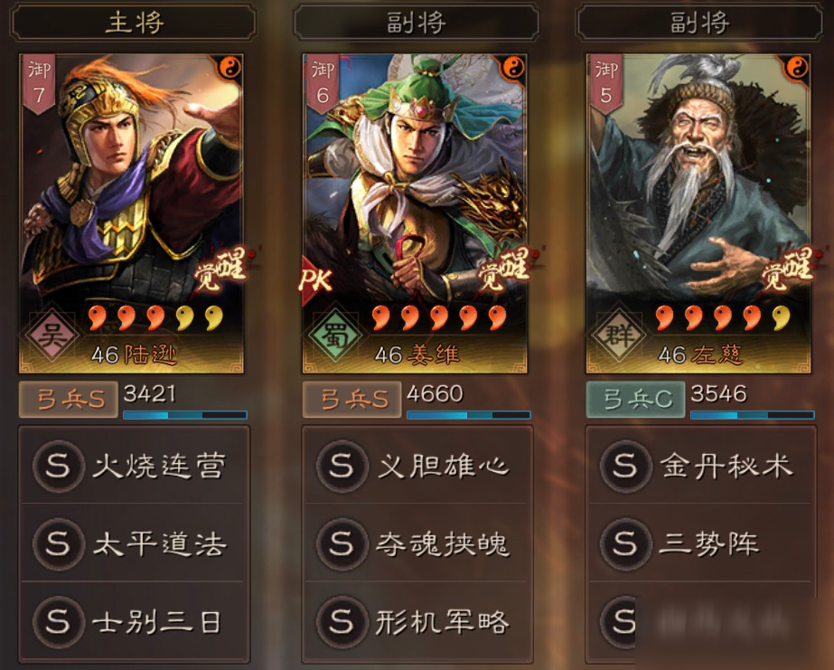 喜欢玩弓兵的主公可以试试麒麟弓,这套由诸葛亮、庞统和姜维组成的蜀国智囊团。诸葛亮带抚辑军民和草船借箭,庞统用太平道法和无当飞军,姜维则选择夺魂挟魄和杯蛇鬼车。这套阵容的特点是稳定性强,但要注意满红和白板差距较大,建议作为第二队或第三队出场。面对枪兵时胜率很高,但遇到突击型骑兵需要谨慎应对。