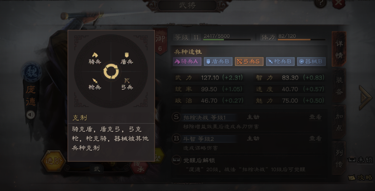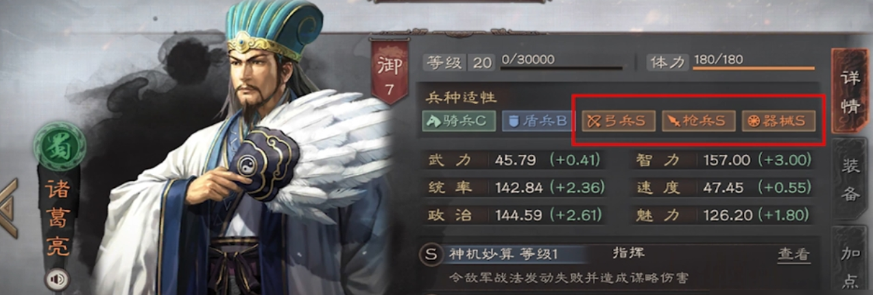 兵种适性直接影响武将属性发挥效率,分为S/A/B/C四个等级。S级适性能发挥武将120%属性,A级为100%,B级85%,C级仅70%。选择兵种时需优先考虑主将的最高适性等级,例如诸葛亮作为唯一拥有3个S级适性的武将,可灵活适应多种阵容。切忌为追求克制效果强行使用低适性兵种,否则可能导致属性大幅衰减。部分特殊武将如甘宁、曹操等具备双S适性,这类武将在组队时应作为核心优先部署。