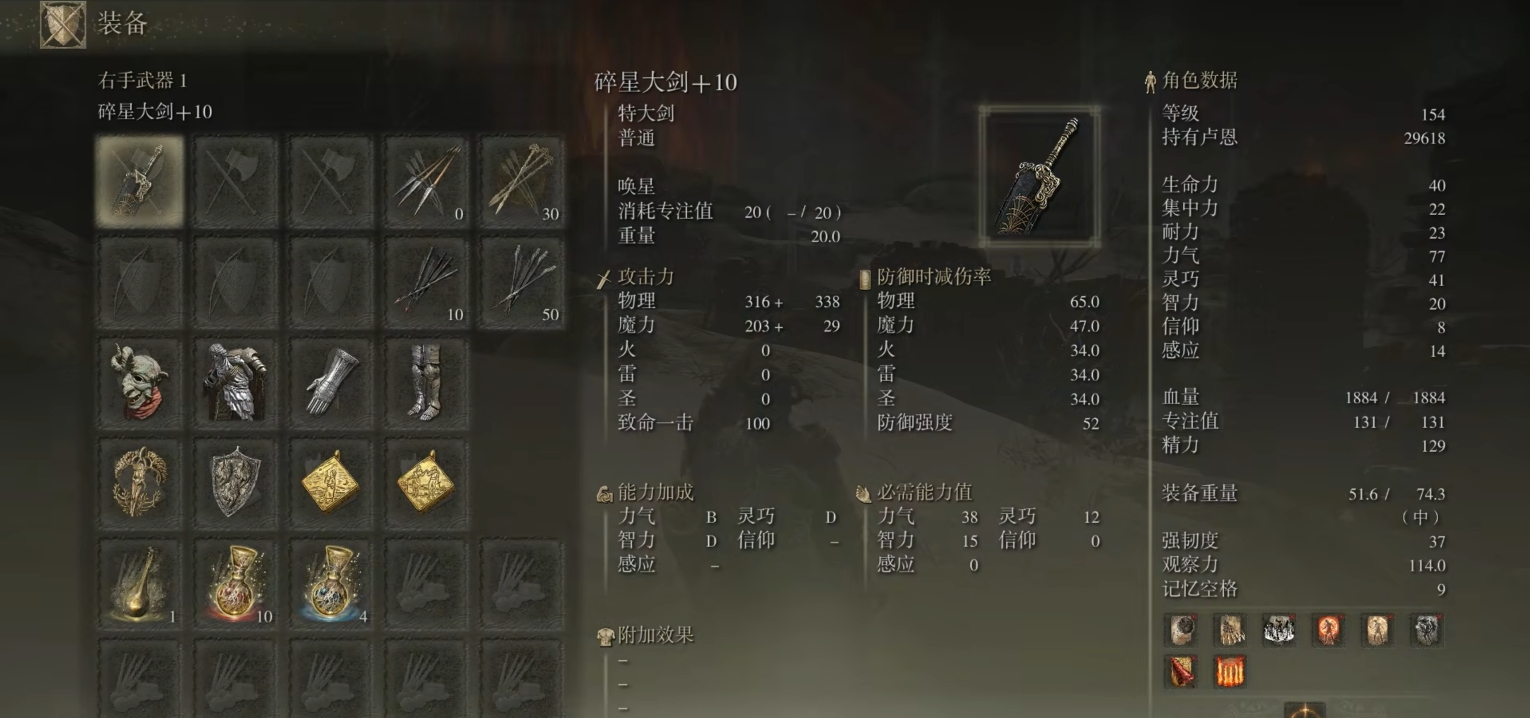 中期开始可以专注提升力量到60,这是第二阶段的软上限,再往上加点收益会大幅降低。别忘了适当补几点灵巧,有些强力武器比如碎星大剑需要18灵巧。如果走双持路线,记得利用1.5倍力量加成的机制,比如力量30时双持等效45点,能提前拿动更高需求的武器。集中力不用太高,10-15足够放战技,除非你想玩祷告辅助。
