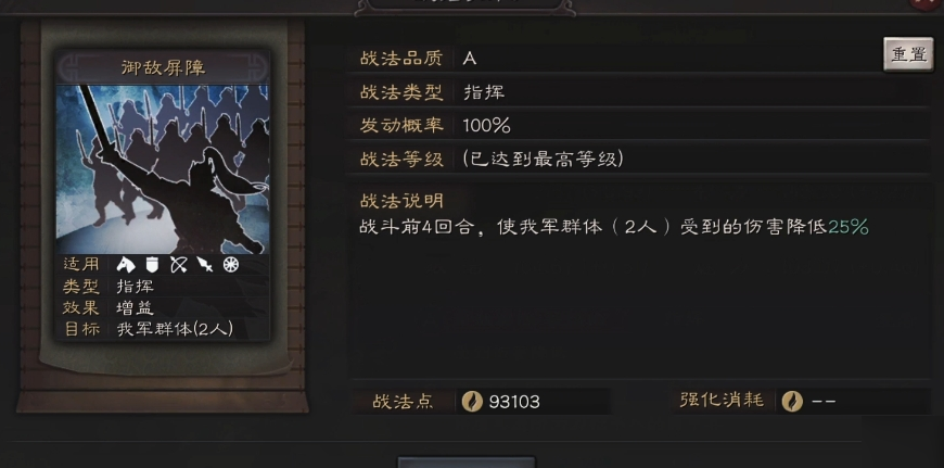 携带藤甲兵时推荐全统率加点(满级统率252),配合军形兵书形成物理减伤闭环;若使用陷阵营或治疗战法则建议全智力加点(满级智力233),虚实兵书的谋略增益效果更显著。第二层技能需针对性调整:对抗高频物理队选择避其锐气,持久战则优先守势。第三层防备或静心分别强化减伤覆盖率与控制抵抗,满红状态下8%攻防加成能进一步放大兵书收益。