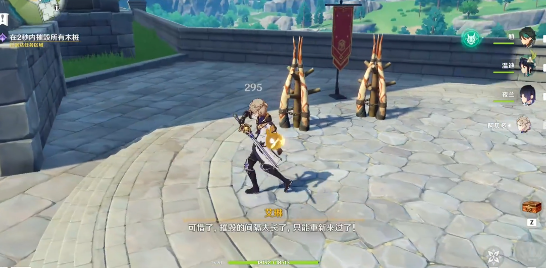 对于弧形排列的6个木桩,最简单的方法是使用大范围攻击技能一次性摧毁。角色如香菱、迪卢克、刻晴等的大招可以覆盖全部木桩。如果伤害不足,可以先将所有木桩削减至残血,再释放技能确保同时击破。另一种通用方法是利用高处下落攻击,传送到附近的高点后跳下触发范围伤害。这种方法对角色练度要求较低,适合新手玩家。
