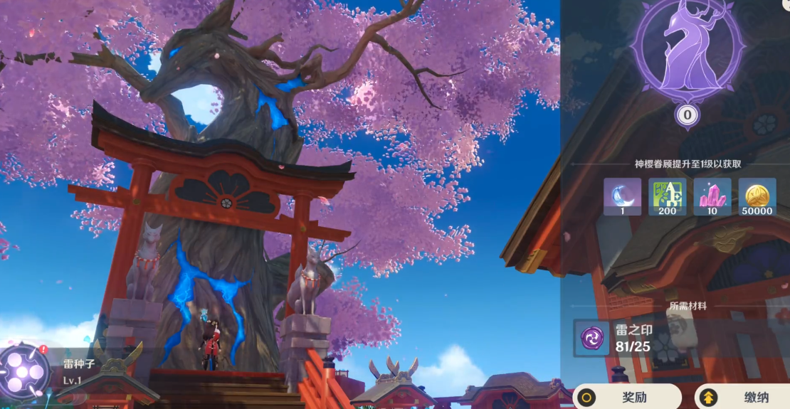 雷樱树力量结晶是最终挑战,表现为强化版无相之雷。其攻击模式包括召唤雷柱、释放追踪闪电等,建议携带火元素主C与护盾角色应对。击败后可获得隐藏成就神无冢作战计划及大量奖励。雷之印积累至一定数量可提升雷樱树等级,解锁更高阶奖励,包括武器突破材料与角色培养资源。探索时建议优先解锁七天神像以获取区域视野,并利用浪船快速移动至离岛目标。