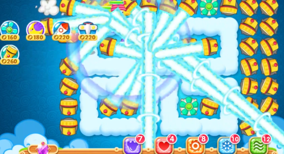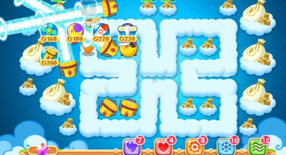 中期阶段打掉第一个钱袋后,可以考虑卖掉飞机,换成1个月亮塔和2个手电筒炮塔。月亮塔是唯一的减速塔,所以千万别多放,手电筒则要集中升级,它们既能帮你搞定击杀任务,又能顺手清理周边的道具。继续清理右边的大钱袋,值2500金币,打掉后换成火箭塔,这种高伤害炮塔能有效应对越来越强的怪物波次。