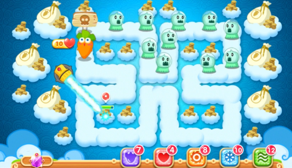 游戏一开始你有588金币,推荐先用玩具飞机来开局,因为它不仅能打怪物,还能快速清理地图上的钱袋道具。钱袋里藏着不少金币,特别是右下角那个小钱袋,值1000金币,在第四波左右就能打掉,这能帮你快速积累资金,为后续发展做准备。记住前期别急着造太多炮塔,优先处理钱袋会更有效率。