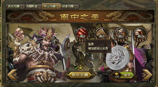 让孟获觉醒,你得先过司马懿这一关,必须等司马懿先觉醒了才行。每次尝试让孟获觉醒,你得准备好15瓶酒,或者直接掏15000宝石。这里得提醒你,用宝石点觉醒是有每天次数上限的,具体能点几次跟你的VIP等级挂钩,比如VIP5以上的玩家,一天最多也只能用五万宝石来点,所以就算你资源多,想靠宝石猛砸完成觉醒,也得老老实实花上好几天。这个过程没有等级硬性要求,但成功率是你尝试次数慢慢往上涨的,前面比较考验耐心,据说点到第150次是保底必成的。