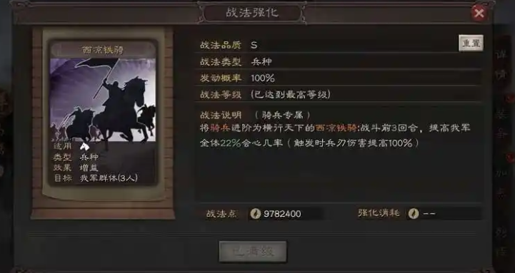 若赛季获得霸业资格,则可兑换更为强力的霸业限定特技。援助特技是八宝夜明铠的专属效果,使佩戴者首回合援护全体友军,承担普通攻击,能有效抵挡当锋摧决等突击战法带来的负面状态,通常由阵容中的辅助或坦克武将佩戴。踩踏特技可用于任意橙色坐骑,其附带的一次伤害能有效触发关银屏将门虎女的震慑效果,是关妹体系队伍的核心组件。根据自身主力武将,兑换如无双(吕布专属)、雄才(孙权专属)等武将专属特技也能带来极大提升。