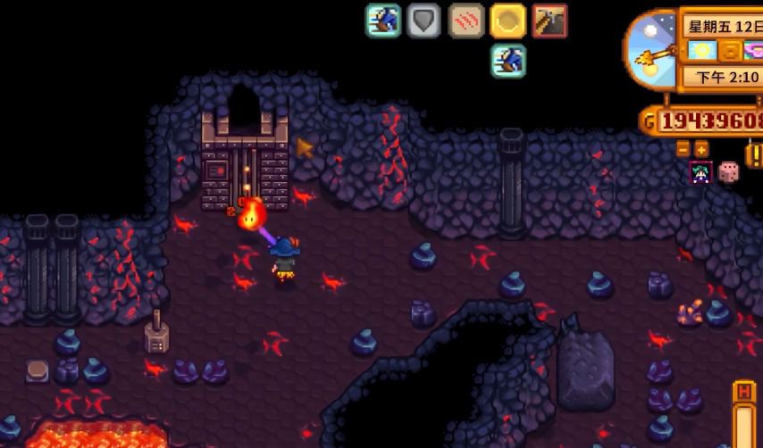 姜岛北部的火山地牢是岛上的重要挑战和资源点,其内部共有10层,没有电梯,离开只能原路返回或使用传送手段。进入火山地牢必须携带水壶,因为需要用其浇灭岩浆开辟道路。地牢内不仅有强大的怪物,也藏着珍贵的矿石、龙牙等稀有材料以及宝箱。首次到达第10层可以解锁一个位于火山顶部的锻造台,用于强化武器和工具。在火山地牢中也可以通过采矿、击败怪物和开启宝箱等方式收集到一定数量的金核桃。