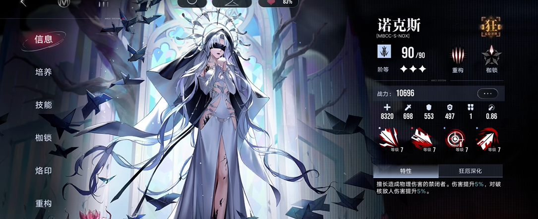 蓟的必杀“燃火灼魂”消耗26点能量,释放后会移动至指定地格,对范围内敌人造成高额法术伤害与1点核心伤害,同时强化自身普攻,持续8秒,期间无法自动回复能量,强化普攻会附加燃烧印记,配合被动二能为友方燃烧体系角色提供法术伤害加成,进一步提升队伍整体输出。狂厄深化解锁后,必杀核心伤害直接+1,达到2点,足以应对多数单核、双核敌人的破核需求,适合搭配曜、烟烟等燃烧主C,组成燃烧破核体系,在破碎防线、暗域等核心密集的关卡中,快速破除敌人核心,为队伍创造输出窗口。