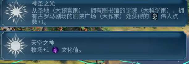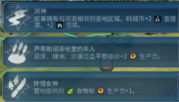 如果神圣之光和河神都被抢了,还可以考虑丰收女神或天空之神。丰收女神能提升种植园的产出,适合资源丰富的开局;天空之神则能加强牧场,如果周围有大量牛羊,选它也不错。不过这些都属于备选方案,优先级不如神圣之光和河神高。