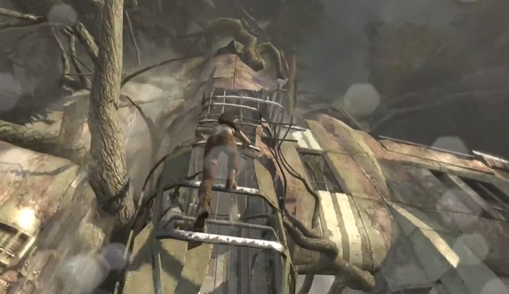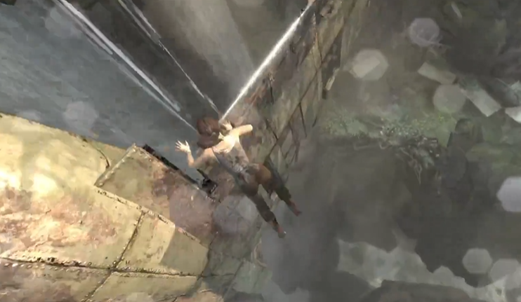 关卡开始后,玩家需利用空中的布幡跃至对面屋子,随后进入连续坍塌区域。这里需要保持快速移动,避免被坠落结构击中。抵达暂时安全的木屋后,会听到枪声并目睹飞行员被盾牌兵刺杀。解决盾牌兵后沿栈桥前进可找到营地峭壁远景,在此处接到罗斯的电话。继续前进穿过山洞时,萝拉会被陷阱捕捉倒悬在树上,获得关键武器绳箭。