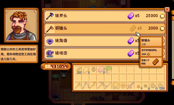 斧头和镐子的升级材料差不多,铜级都是5个铜锭+2000金,铁级5个铁锭+5000金,金级5个金锭+10000金,铱级5个铱锭+25000金。斧头升级后砍树更快,还能处理硬木桩;镐子升级后能砸开更大的石头,挖矿时特别省力。记得优先升级这两样,毕竟木材和矿石是农场建设的刚需。